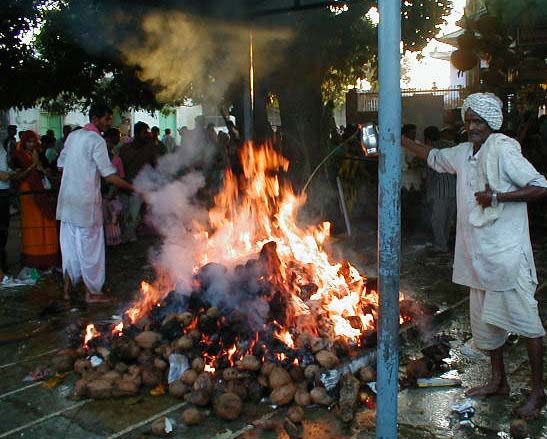The religious part of the festival involves providing offerings to the diety in the form of coconuts and gee (clarified butter) that are burnt in a large havan (fire) outside the temple. Other offerings of sweets are also provided and shared amongst friends and family. After the formalities of the religious duties have been completed, it's time to go to the fair! There are merry-go-round, ferris wheel and other rides to choose from (all man powered) as well as a plethera of food stalls.