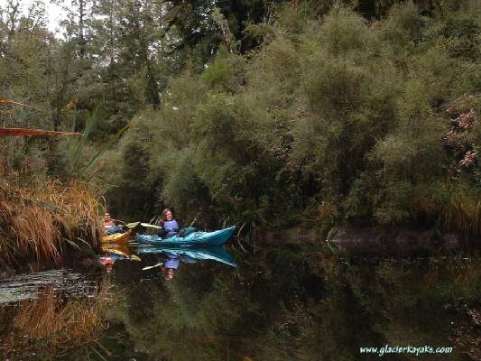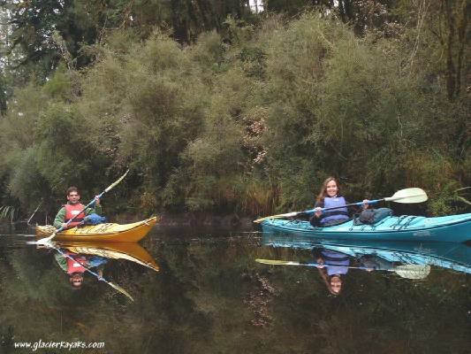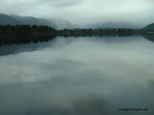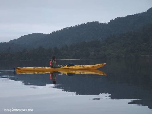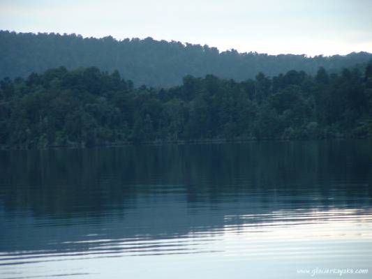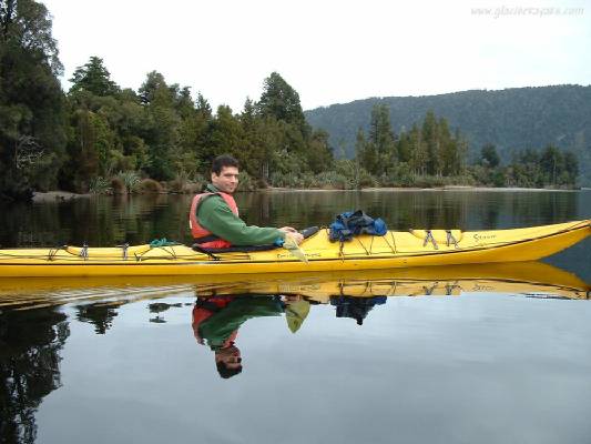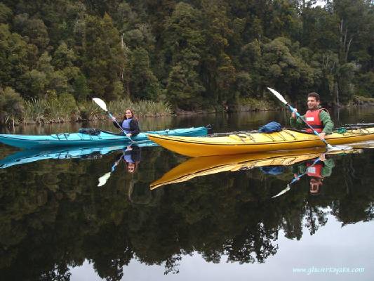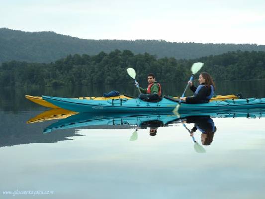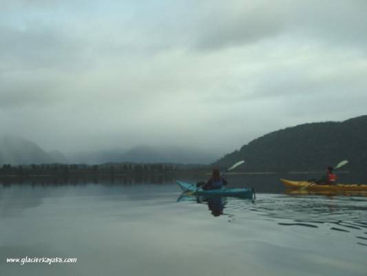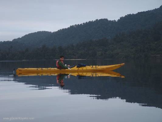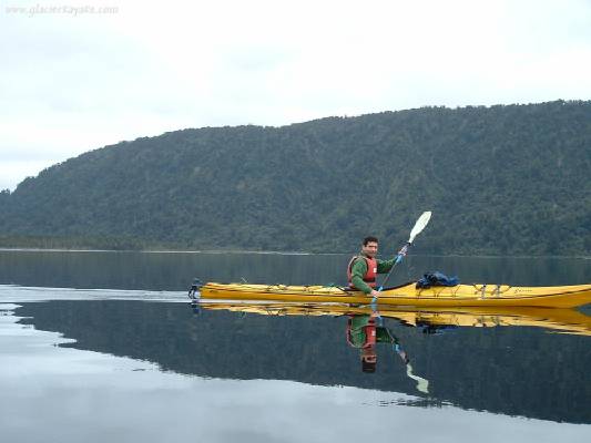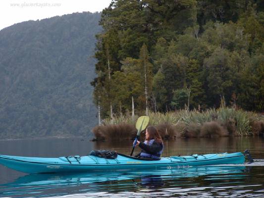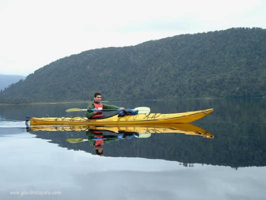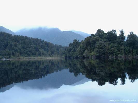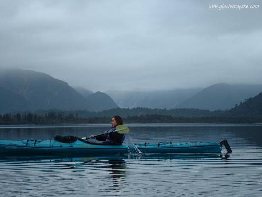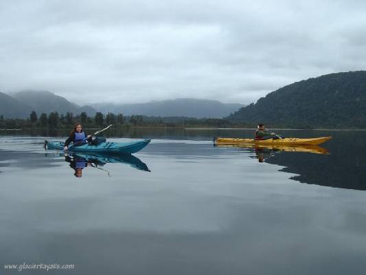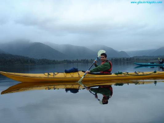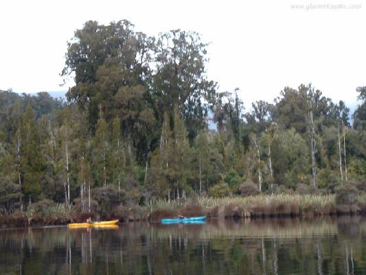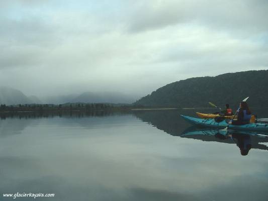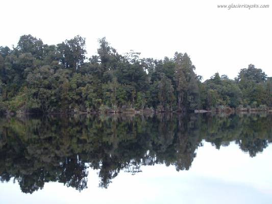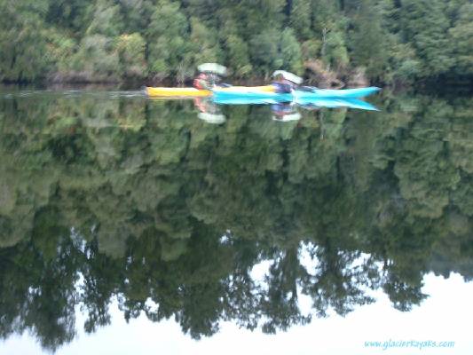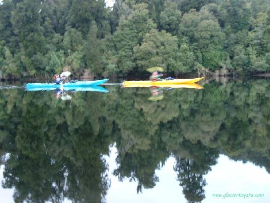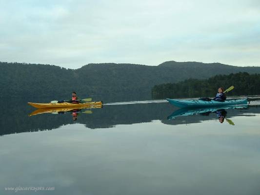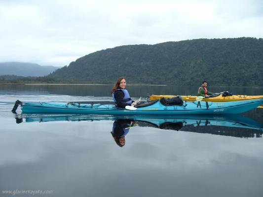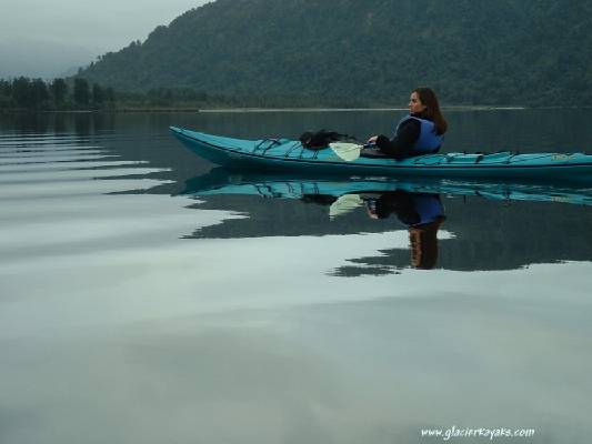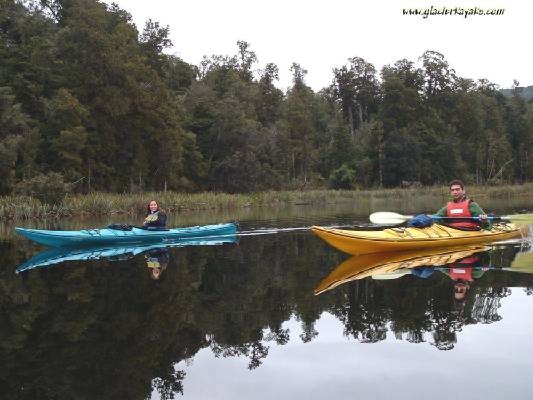 We had a lazy day, up late and just a little amble around town this morning. This afternoon we went kayaking on a lake just outside of Frans Josef town. Just amazing. Such a tranquil, quiet place. We paddled over 6 square kilometres of mirror flat lake, surrounded by mountains draped in rain forest. A superb end to the day.