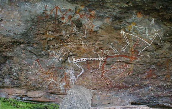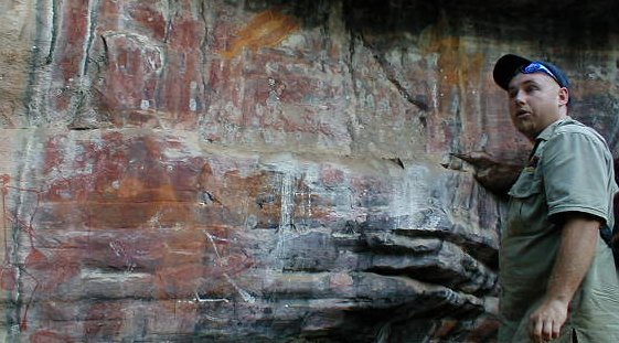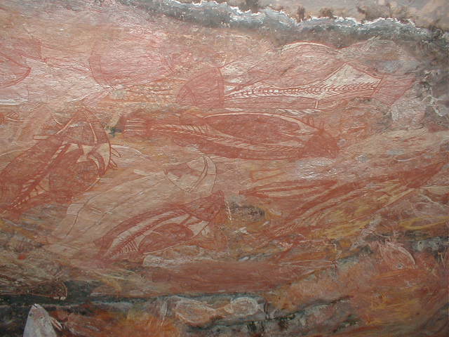 We were up at five this morning, for the drive to Kakadu National Park the largest land based National Park in oz. It's world listed for both natural beauty and cultural heritage. We walked a few km to Gubara, where there's a little waterfall and a pool to swim & play in. It was only a short scramble round to 'Eden' pool where there was another waterfall and pool to splash about in. It's a tough life. At Norlangie Rock we saw some recent (1960s) Aboriginal art painted by Baramundi Charlie.