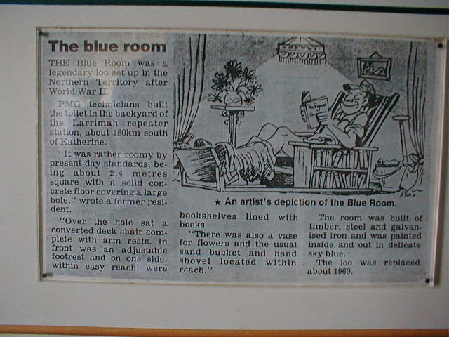 We got up early this morning (quelle suprise) as we've around 800km to cover today. We went for a swim at the Malaranka thermal pools in Elsey National Park first thing. Larrimah with a population of 16 people was the next stop. it used to be a telegraph repeater station and a military base. As the latter, it was famous (relatively) for 'the blue room", a rather sumptuous toilet by the (obviously bored) telegraph operators. It was fitted out with deckchair, complete with armrests, flowers and a fully stocked library