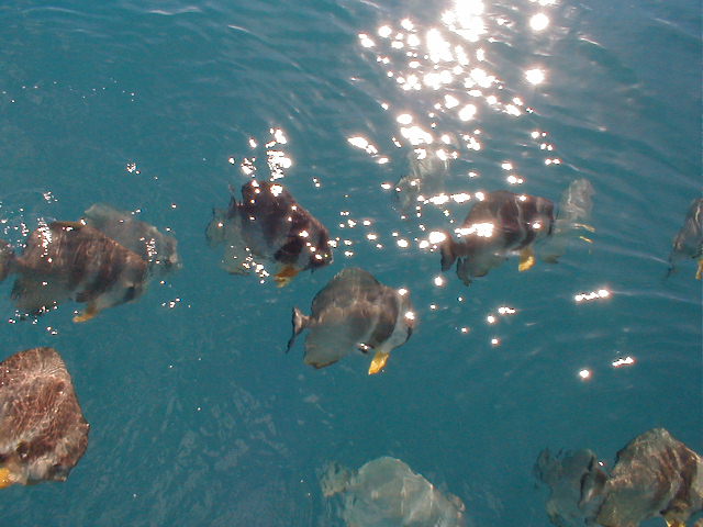 Our next, and last stop was Luncheon Bay which is also on Hook Island. This is another snorkelling site and it is simply amazing. One of the most expansive places I have ever dived or snorkelled. There was a shoal of big bat fish waiting for us when we arrived (although they didn't much like me jumping in on top of them to get a closer look!). I also saw a shoal of around half-a-dozen Wrass that were so big I almost spat my snorkel out in suprise. These fish must have been over a metre and a half long and a metre high. They were big boys (well, only one was, the others would have been all girls). Shortly after spotting them, I saw the largest number of fish that I think I have ever seen in my life. The sea was thick of these little guys. They were all just sitting in the current right next to a large rock. They started to swim around it as I swam a little closer to them, and so I followed them round it. Straight into the biggest suprise of my trip so far.