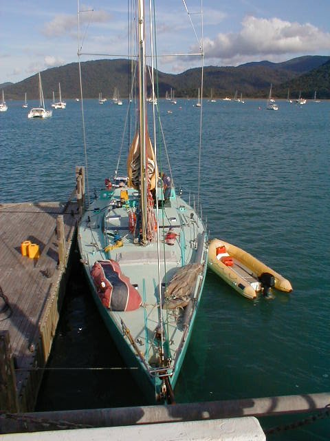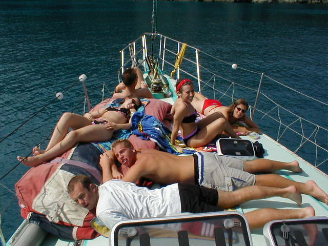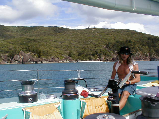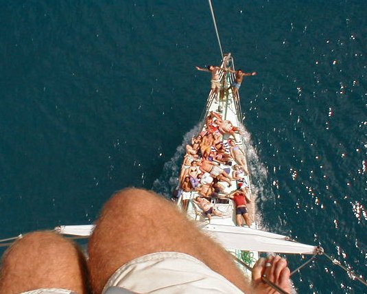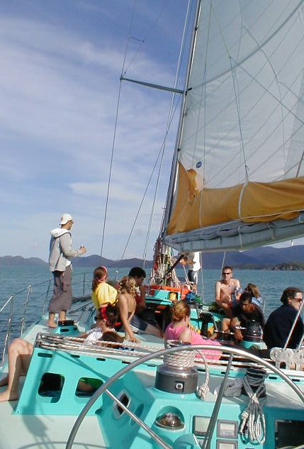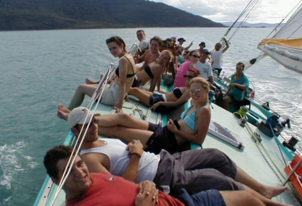 We sailed (ARSE) almost all the way home. the weather has been just perfect for us. Beautiful sunshiny days with just enough wind in the late mornings or afternoons to get the sails up. Today though we had some almost serious sailing wind and Scotty cranked the throttle up and the boat over to take advantage of it. These yachts are designed to sail (ARSE - if you don't know, you weren't on board, and it doesn't matter) heeled over at quite an angle and we were doing pretty well, with our low side railings kissing the water. We were sailing (ARRRSE) south, upwind, back into Shute harbour and so were forced into a few tacks to make it back home. We were doing pretty good, the faithful, keen (if slightly hungover) crew were doing their best to distribute the weight correctly by moving sides as we spun through the wind. After a couple of turns, we were looking almost professional, 'the best tack I've seen - in the last three days', was one comment, 'the best crew we've had this trip', another. Then, disaster, our (rather worn out) headsail ripped and we witnessed what real crewing is all about. Within fifteen seconds of it happening, the two guys had dropped and stowed the headsail - a task that took 10 of us almost a couple of minutes to do - impressive.